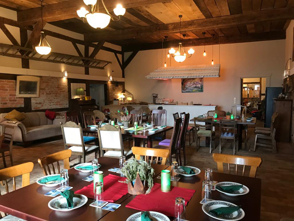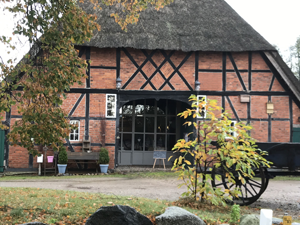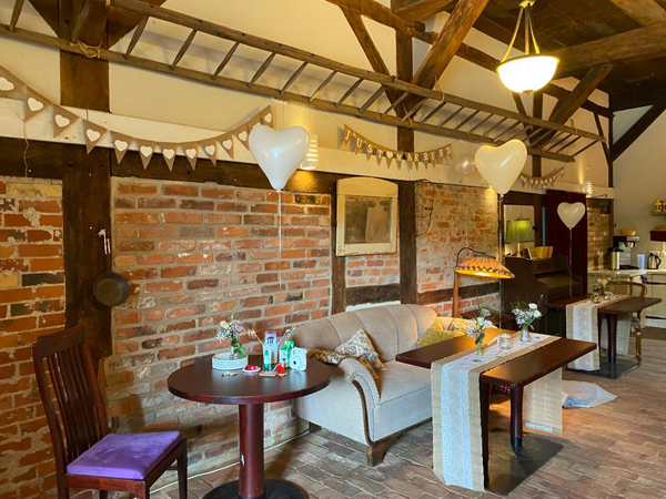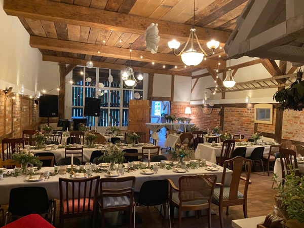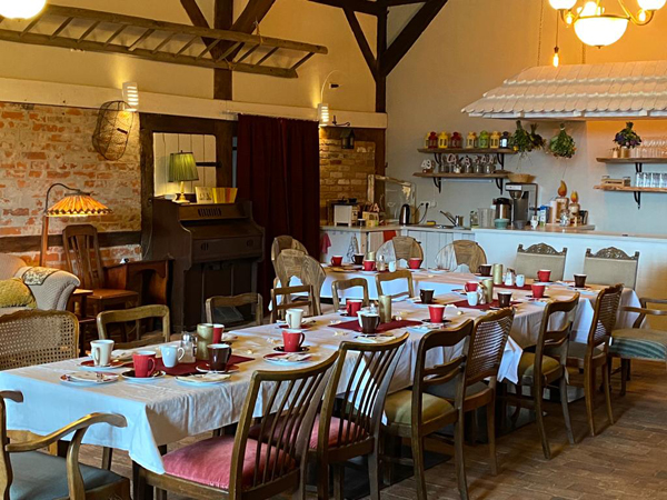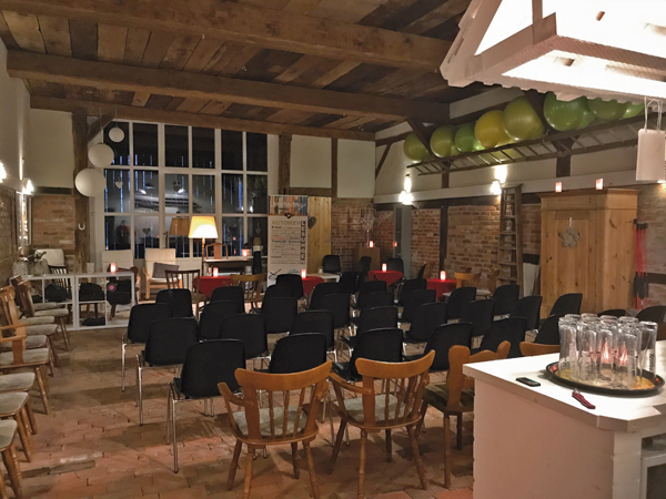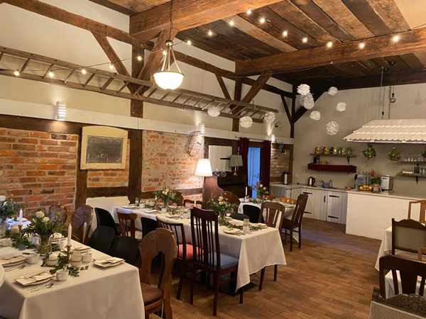 Die urige Diele bietet auf 86qm restaurierte Fachwerkwände, eine imposante Decke aus Eichenschwarten und einen beheizten Fußboden aus alten Ziegelsteinen. So verströmt der Raum im Winter ein Gefühl anheimelnder Wärme, im Sommer ist er dagegen angenehm kühl. Die Diele enthält einen Tresen und eine Teeküche im Vintage-Look. Dazugehörig sind restaurierte Stallungen, wie der alte Pferdestall, als eigener Buffetraum mit weiteren 10qm nutzbar und ein Garderoben/Umkleideraum (7qm) mit separatem Eingang.